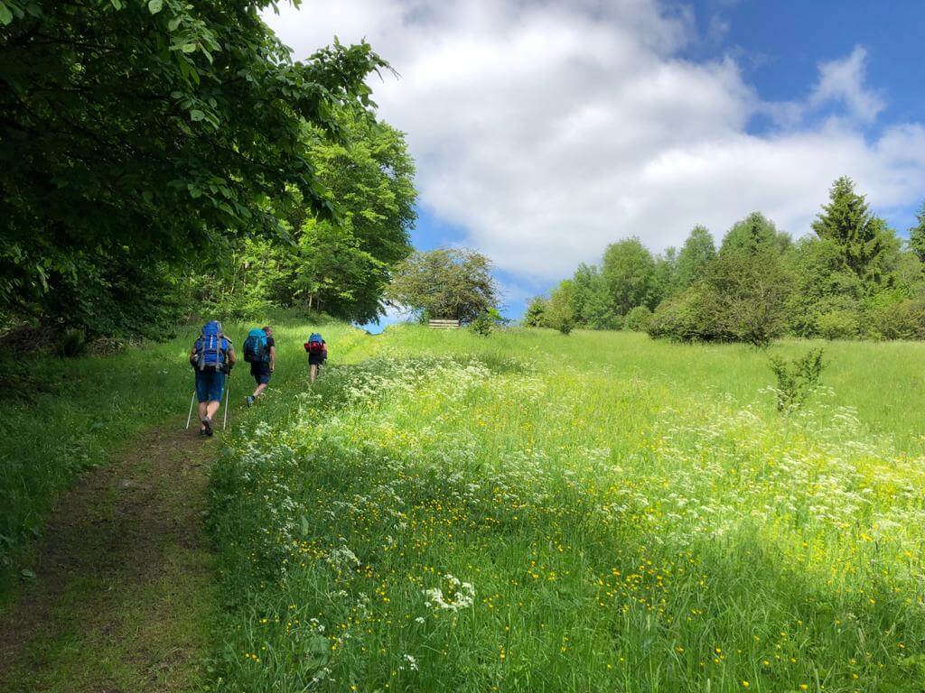 Wir starten in der Ortsmitte von Stralsbach. Sehr abwechslungsreich führt der Weg über Feldwege, hohe Wiesen, am Waldrand entlang und durch die Ortschaften Frauenroth und Premich, wo wir schon bald sehr früh unser Ziel den Kreuzberg vor Augen haben. Zwischendurch stärken wir uns aus dem Rucksack mit einer guten Brotzeit. In Langenleiten füllen wir unsere Wasservorräte im Supermarkt noch einmal auf. Es ist heute sehr heiß und die meisten Höhenmeter haben wir noch vor uns. Der Weg, der nun zum größten Teil durch Wald geht, ist rechts und links gesäumt vom wilden Bärlauch. Vor dem letzten und langen Anstieg machen wir noch eine Pause in einem gemütlichen Unterstand mit Sitzgruppe und kommen am späten Nachmittag etwas erschöpft, aber glücklich am Kreuzberg an. Der ca. 12 kg schwere Rucksack ist für uns alle doch noch gewöhnungsbedürftig. Schweinsbraten, Klosterbier und ein wunderschöner Sonnenuntergang lassen die ersten Schmerzen vergessen.