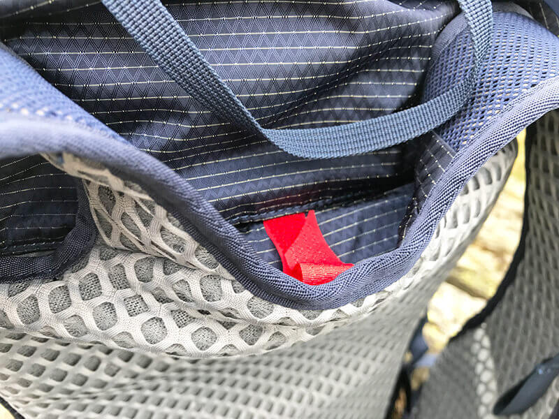 Schaut man sich das Innere des durchgängigen Hauptfachs an, erblickt man sofort das goldgelbe Drahtgestell beim Fast Hike 45, welches dem leichtgewichtigen Rucksack seine Stabilität verleiht. Will man bei dem eh schon leichten Rucksack das Gewicht noch weiter reduzieren, kann man dazu dieses Drahtgestell entfernen.