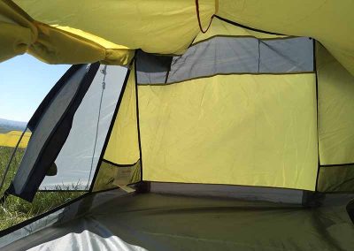 Das Zelt hat einen seitlichen Eingang mit separat verwendbarem Moskitoschutz. Allerdings kann der Eingang nur an einer Seite aufgerollt werden, das ist etwas seltsam, da man da die Chance eines komfortableren Einstiegs sowie einer noch besseren Belüftung vergibt. Der Vorraum ist mit 50×50 cm ziemlich klein und bietet leider nur einem Gepäckstück Platz. Schlecht bei einem 2-Personenzelt. Es gibt am Fußende mit Zugang vom Innenzelt aus noch eine weitere Staumöglichkeit, allerdings ist sie, bedingt durch die geringe Höhe, nur für kleinere Dinge wie Kochgeschirr etc. zu nutzen. Apropos Höhe, diese ist mit 95cm max. Kopffreiheit nur für kleinere Personen gut geeignet. Am Fußende stehen gerade mal 65cm Innenzelthöhe zur Verfügung. Insgesamt würde ich das Zelt eher für nicht so groß gewachsene Leute empfehlen, da auch die Länge des Schlafraumes nur 215cm beträgt. Für große Personen wird es da schnell beengt.