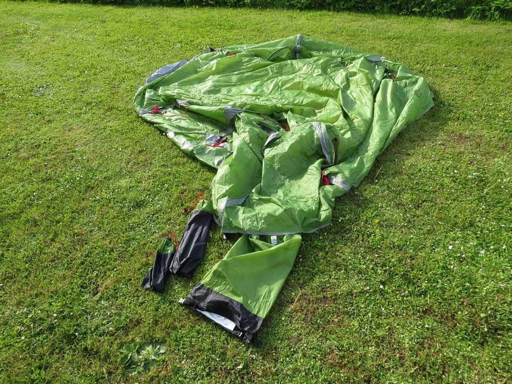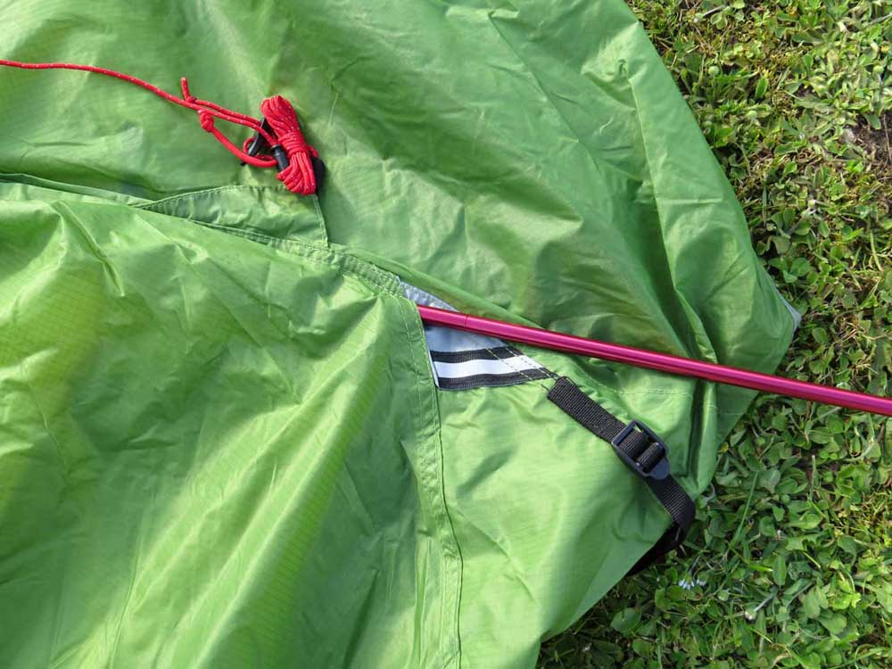Nach dem Auspacken werden wir zu Beginn gleich positiv überrascht: das Zelt ist in einem leichten Drybag (wasserfester Trockensack) gepackt. Ein großer Vorteil, wenn man bei Wind und Wetter unterwegs ist (besonders bei den derzeitig unzuverlässigen Wetterprognosen). Zum Material: Gestänge und Heringe bietet Roben aus sehr robustem DAC extra-leichtem Aluminium. Die V-profilerten Heringe lassen sich sehr einfach in den Boden stecken und sind trotz ihres leichten Gewichts stark und formfest. Das Zelt besteht aus zwei Teilen: Außen- und Innenzelt. Da diese trennbar sind, muss erst mal das Außenzelt aufgebaut werden, in welches dann das Innenzelt „reingeclippt“ wird. Super praktisch bei Regenwetter. Um bei Trockenwetter Zeit zu sparen, kann es aber auch als Gesamtkonstrukt aufgebaut werden. Das Goshawk ist grundsätzlich leicht und intuitiv aufzubauen. Nur das Finden der Stangentunnel hat uns anfangs ein Rästel aufgegeben. Aber auch dies haben wir nach kurzem Experimentieren schnell herausgefunden (siehe Bild). Als 2-Mann-Zelt konzipiert, lässt es sich zu zweit auch am besten aufbauen. Die Gestänge fädeln sich einfach durch das innenliegende Stangenkanalsystem und bilden dadurch die Hauptform. Die Abspannleinen sind optimal verteilt und stabilisieren das Zelt optimal.