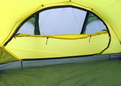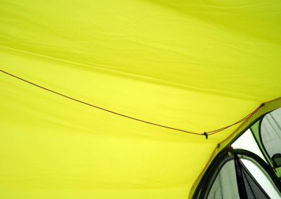 So viel zu den technischen Details. Jetzt kommt der Praxistest: wie schläft es sich in dem Zelt, ist genug Platz zum Kleiderwechseln und Gepäckverstauen? Liegefläche und Innenraum sind wirklich großzügig. Aufrechtes Sitzen ist problemlos möglich, was aus eigener Erfahrung absolut kein Standard bei vielen Tunnel-Trekkingzelten ist!. Die Liegefläche kann sich sehen lassen: ganz locker haben zwei Person (bis ca. 1,80m Größe) Platz. Das kann sich sehen lassen, denn wir haben sogar noch Stauraum für ein bisschen Material übrig, ohne Kompromisse eingehen zu müssen und das Buch unter den Kopf schieben und Kulturtasche unter die Beine schieben zu müssen. Mit allem, was wir mit ins Zelt nehmen können, fühlen wir uns fast wie zu Hause im Wohnzimmer. Nette Atmosphäre! Eine schöne Idee ist die Wäscheleine an der Zeltdecke. Optimal, um Socken oder andere feuchte Austrüstungsteile zu trocknen. Klar, dass tropfnasse Kleider lieber draußen aufgehängt werden sollten. Die Taschen in jeder Ecke sind optimal für kleine Sachen wie Stirnlampe, Handy und verhindern nervenaufreibendes Suchen, wenn man mitten in der Nacht aufwacht. Außerdem hat alles hat seinen Platz, besonders wichtig auf längeren Touren. Wohin mit den Rucksäcken? Auch hier bietet uns das Robens Goshawk mehr Komfort, als wir es bisher gewohnt sind: an jeder Seite befinden sich große Vorräume für Wanderschuhe, Rucksack, Campingmaterial, die dort wettergeschützt und griffbereit verstaut werden können. So erübrigt sich das umständliche über den Zeltpartner Hinwegrollen, um an seinen Rucksack zu kommen. Egal, auf welcher Seite man schläft: Zelttür auf – Rucksack da. Zudem erhöht sich dadurch natürlich der Stauraum auf das Doppelte. Auf der einen Seite ist dieser Vorraum über zwei Öffnungen betretbar, was die Flexibilität bei der Auswahl des Standorts erhöht. Der andere Vorraum verfügt über einen einzigen Eingang, den man in ein Vordach umwandeln kann. Alles, was man dazu braucht, sind zwei Trekkingstöcke. Für uns, die mit Outdoorküche unterwegs sind, ideal und bei schlechtem Wetter goldwert. Es erlaubt risikolos unter Dach, aber trotzdem an der frischen Luft den Gaskocher zu nutzen und so das fiese Kondenswasser, das beim Kochen entsteht, im Zelt zu vermeiden. Und da kommen wir zum Thema Kondenswasser und Lüftung. Schon mal im Zelt aufgewacht und die Tropfen an der Innenwand des Zelts entdeckt? Woher kommt das? Über Nacht schwitzen und vor allem atmen wir ca. einen Liter Wasser aus. Besonders für ein synthetisches Zelt ist ein gut ausgebautes Lüftungssystem wichtig, damit sich nicht alles im Zelt, Schlafsack und Ausrüstung staut und den Komfort extrem verschlechtert. Aber auch hier war Robens clever: viele Moskitonetze und regendichte Lüftungsöffnungen ermöglichen eine optimale Lüftung bei jedem Wetter.Fazit: